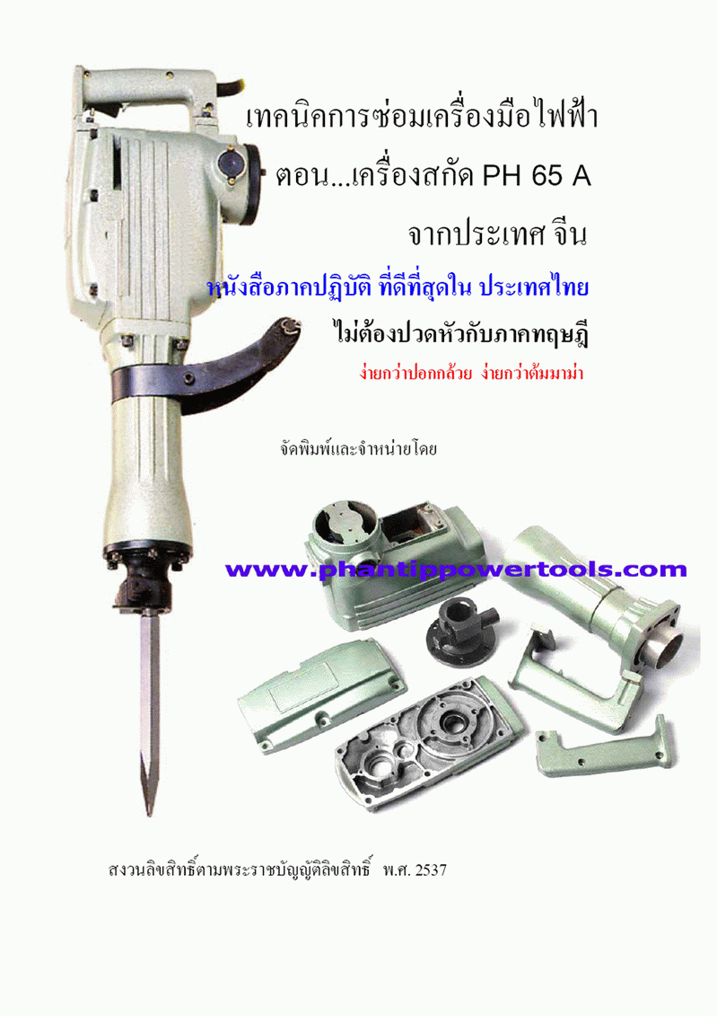 เทคนิคการซ่อมเครื่องมือไฟฟ้า ตอน เครื่องสกัดคอนกรีต รุ่น PH 65 A หนังสือเล่มนี้อ่านแล้วท่านสามารถซ่อมได้ทั้ง ของ HITACHI รุ่น PH 65 A และ สินค้าที่นำเข้ามาจากประเทศจีน ที่มีรูปทรงตามหน้าปกหนังสือเล่มนี้หนังสือเล่มนี้มีเนื้อหา ผนวกรวมเข้ากันกับ หนังสือการพันฟิลคอยด์ เล่มที่ B 023 เนื่องจากตัวอย่างในการ