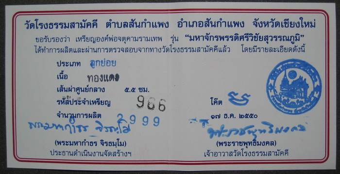 ศูนย์พระเครื่อง phantippowertools.com พระแท้ ตามมาตรฐานสากล ยินดีต้อนรับ นักนิยมสะสมพระเครื่องทุกท่าน เราบริการให้เช่าบูชา พระเครื่อง พระกรุ พระเนื้อดิน เหรียญคณาจารย์ ต่างๆ ในราคาย่อมเยาว์ มีทั้งประเภทรับประกันแท้ และ ประเภทวัดดวง ( ไม่มีการรับประกัน ) สำหรับพระเครื่องที่อยู่ในหน้านี้ รับประกันแท้ทุกองค์ ตามมาตรฐานสากล ติดต่อสอบถามที่ โทรศัพท์ 056-310760 มือถือ 081- 7075038 จตุคามรามเทพ รุ่น มหาจักรพรรดิ์ศรีวิชัยสุวรรณภูมิ เหรียญบาตรนํ้ามนต์ เนื้อทองแดง ขนาด 5.5 ซ.ม. เข้มขลังดุดัน และ อ่อนช้อย หมาบเลขกำกับเหรียญ 966 สภาพคัดสวย รายการที่ D 348 ราคาเช่าบูชา 1,000 บาท นี่คืออีกหนึ่งผลงานของช่างเม้าท์ จำนวนการสร้าง 2999 องค์