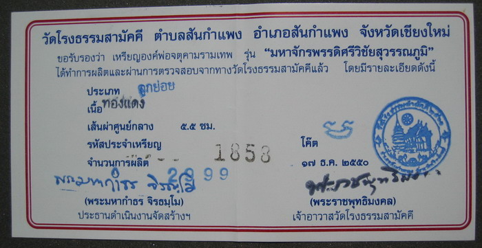 ศูนย์พระเครื่อง phantippowertools.com พระแท้ ตามมาตรฐานสากล ยินดีต้อนรับ นักนิยมสะสมพระเครื่องทุกท่าน เราบริการให้เช่าบูชา พระเครื่อง พระกรุ พระเนื้อดิน เหรียญคณาจารย์ ต่างๆ ในราคาย่อมเยาว์ มีทั้งประเภทรับประกันแท้ และ ประเภทวัดดวง ( ไม่มีการรับประกัน ) สำหรับพระเครื่องที่อยู่ในหน้านี้ รับประกันแท้ทุกองค์ ตามมาตรฐานสากล ติดต่อสอบถามที่ โทรศัพท์ 056-310760 มือถือ 081- 7075038 จตุคามรามเทพ รุ่น มหาจักรพรรดิ์ศรีวิชัยสุวรรณภูมิ เหรียญบาตรนํ้ามนต์ เนื้อทองแดง ขนาด 5.5 ซ.ม. เข้มขลังดุดัน และ อ่อนช้อย หมาบเลขกำกับเหรียญ 1858 สภาพคัดสวย รายการที่ D 350 ราคาเช่าบูชา 1,000 บาท นี่คืออีกหนึ่งผลงานของช่างเม้าท์ จำนวนการสร้าง 2999 องค์