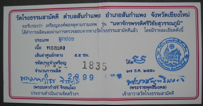ศูนย์พระเครื่อง phantippowertools.com พระแท้ ตามมาตรฐานสากล ยินดีต้อนรับ นักนิยมสะสมพระเครื่องทุกท่าน เราบริการให้เช่าบูชา พระเครื่อง พระกรุ พระเนื้อดิน เหรียญคณาจารย์ ต่างๆ ในราคาย่อมเยาว์ มีทั้งประเภทรับประกันแท้ และ ประเภทวัดดวง ( ไม่มีการรับประกัน ) สำหรับพระเครื่องที่อยู่ในหน้านี้ รับประกันแท้ทุกองค์ ตามมาตรฐานสากล ติดต่อสอบถามที่ โทรศัพท์ 056-310760 มือถือ 081- 7075038 จตุคามรามเทพ รุ่น มหาจักรพรรดิ์ศรีวิชัยสุวรรณภูมิ เหรียญบาตรนํ้ามนต์ เนื้อทองแดง ขนาด 5.5 ซ.ม. เข้มขลังดุดัน และ อ่อนช้อย หมาบเลขกำกับเหรียญ 1835 สภาพคัดสวย รายการที่ D 351 ราคาเช่าบูชา 1,000 บาท นี่คืออีกหนึ่งผลงานของช่างเม้าท์ จำนวนการสร้าง 2999 องค์