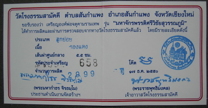 ศูนย์พระเครื่อง phantippowertools.com พระแท้ ตามมาตรฐานสากล ยินดีต้อนรับ นักนิยมสะสมพระเครื่องทุกท่าน เราบริการให้เช่าบูชา พระเครื่อง พระกรุ พระเนื้อดิน เหรียญคณาจารย์ ต่างๆ ในราคาย่อมเยาว์ มีทั้งประเภทรับประกันแท้ และ ประเภทวัดดวง ( ไม่มีการรับประกัน ) สำหรับพระเครื่องที่อยู่ในหน้านี้ รับประกันแท้ทุกองค์ ตามมาตรฐานสากล ติดต่อสอบถามที่ โทรศัพท์ 056-310760 มือถือ 081- 7075038 จตุคามรามเทพ รุ่น มหาจักรพรรดิ์ศรีวิชัยสุวรรณภูมิ เหรียญบาตรนํ้ามนต์ เนื้อทองแดง ขนาด 5.5 ซ.ม. เข้มขลังดุดัน และ อ่อนช้อย หมาบเลขกำกับเหรียญ 658 สภาพคัดสวย รายการที่ D 352 ราคาเช่าบูชา 1,000 บาท นี่คืออีกหนึ่งผลงานของช่างเม้าท์ จำนวนการสร้าง 2999 องค์