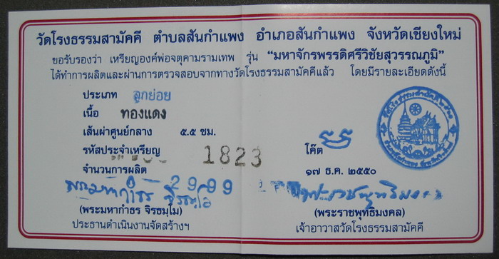 ศูนย์พระเครื่อง phantippowertools.com พระแท้ ตามมาตรฐานสากล ยินดีต้อนรับ นักนิยมสะสมพระเครื่องทุกท่าน เราบริการให้เช่าบูชา พระเครื่อง พระกรุ พระเนื้อดิน เหรียญคณาจารย์ ต่างๆ ในราคาย่อมเยาว์ มีทั้งประเภทรับประกันแท้ และ ประเภทวัดดวง ( ไม่มีการรับประกัน ) สำหรับพระเครื่องที่อยู่ในหน้านี้ รับประกันแท้ทุกองค์ ตามมาตรฐานสากล ติดต่อสอบถามที่ โทรศัพท์ 056-310760 มือถือ 081- 7075038 จตุคามรามเทพ รุ่น มหาจักรพรรดิ์ศรีวิชัยสุวรรณภูมิ เหรียญบาตรนํ้ามนต์ เนื้อทองแดง ขนาด 5.5 ซ.ม. เข้มขลังดุดัน และ อ่อนช้อย หมาบเลขกำกับเหรียญ 1823 สภาพคัดสวย รายการที่ D 354 ราคาเช่าบูชา 1,000 บาท นี่คืออีกหนึ่งผลงานของช่างเม้าท์ จำนวนการสร้าง 2999 องค์
