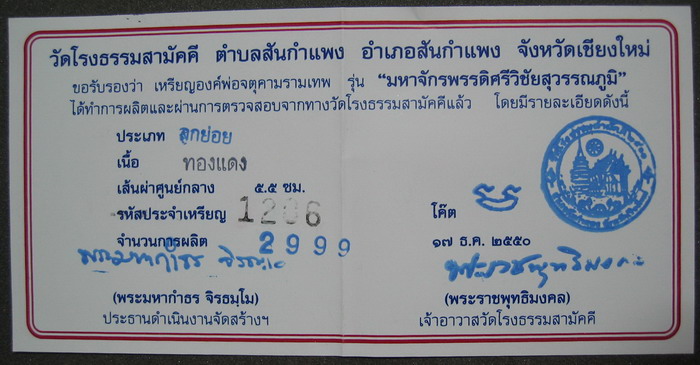 ศูนย์พระเครื่อง phantippowertools.com พระแท้ ตามมาตรฐานสากล ยินดีต้อนรับ นักนิยมสะสมพระเครื่องทุกท่าน เราบริการให้เช่าบูชา พระเครื่อง พระกรุ พระเนื้อดิน เหรียญคณาจารย์ ต่างๆ ในราคาย่อมเยาว์ มีทั้งประเภทรับประกันแท้ และ ประเภทวัดดวง ( ไม่มีการรับประกัน ) สำหรับพระเครื่องที่อยู่ในหน้านี้ รับประกันแท้ทุกองค์ ตามมาตรฐานสากล ติดต่อสอบถามที่ โทรศัพท์ 056-310760 มือถือ 081- 7075038 จตุคามรามเทพ รุ่น มหาจักรพรรดิ์ศรีวิชัยสุวรรณภูมิ เหรียญบาตรนํ้ามนต์ เนื้อทองแดง ขนาด 5.5 ซ.ม. เข้มขลังดุดัน และ อ่อนช้อย หมาบเลขกำกับเหรียญ 1206 สภาพคัดสวย รายการที่ D 355 ราคาเช่าบูชา 1,000 บาท นี่คืออีกหนึ่งผลงานของช่างเม้าท์ จำนวนการสร้าง 2999 องค์