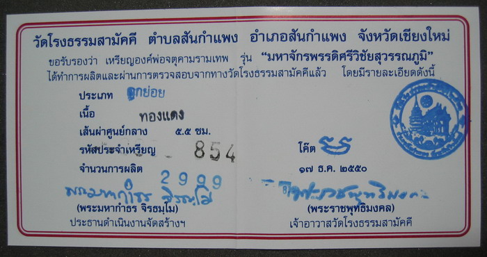 ศูนย์พระเครื่อง phantippowertools.com พระแท้ ตามมาตรฐานสากล ยินดีต้อนรับ นักนิยมสะสมพระเครื่องทุกท่าน เราบริการให้เช่าบูชา พระเครื่อง พระกรุ พระเนื้อดิน เหรียญคณาจารย์ ต่างๆ ในราคาย่อมเยาว์ มีทั้งประเภทรับประกันแท้ และ ประเภทวัดดวง ( ไม่มีการรับประกัน ) สำหรับพระเครื่องที่อยู่ในหน้านี้ รับประกันแท้ทุกองค์ ตามมาตรฐานสากล ติดต่อสอบถามที่ โทรศัพท์ 056-310760 มือถือ 081- 7075038 จตุคามรามเทพ รุ่น มหาจักรพรรดิ์ศรีวิชัยสุวรรณภูมิ เหรียญบาตรนํ้ามนต์ เนื้อทองแดง ขนาด 5.5 ซ.ม. เข้มขลังดุดัน และ อ่อนช้อย หมาบเลขกำกับเหรียญ 854 สภาพคัดสวย รายการที่ D 356 ราคาเช่าบูชา 1,000 บาท นี่คืออีกหนึ่งผลงานของช่างเม้าท์ จำนวนการสร้าง 2999 องค์