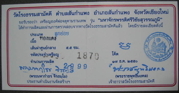 ศูนย์พระเครื่อง phantippowertools.com พระแท้ ตามมาตรฐานสากล ยินดีต้อนรับ นักนิยมสะสมพระเครื่องทุกท่าน เราบริการให้เช่าบูชา พระเครื่อง พระกรุ พระเนื้อดิน เหรียญคณาจารย์ ต่างๆ ในราคาย่อมเยาว์ มีทั้งประเภทรับประกันแท้ และ ประเภทวัดดวง ( ไม่มีการรับประกัน ) สำหรับพระเครื่องที่อยู่ในหน้านี้ รับประกันแท้ทุกองค์ ตามมาตรฐานสากล ติดต่อสอบถามที่ โทรศัพท์ 056-310760 มือถือ 081- 7075038 จตุคามรามเทพ รุ่น มหาจักรพรรดิ์ศรีวิชัยสุวรรณภูมิ เหรียญบาตรนํ้ามนต์ เนื้อทองแดง ขนาด 5.5 ซ.ม. เข้มขลังดุดัน และ อ่อนช้อย หมาบเลขกำกับเหรียญ 1870 สภาพคัดสวย รายการที่ D 360 ราคาเช่าบูชา 1,000 บาท นี่คืออีกหนึ่งผลงานของช่างเม้าท์ จำนวนการสร้าง 2999 องค์