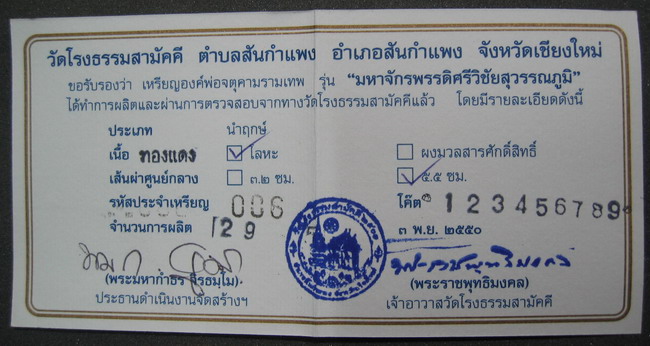 ศูนย์พระเครื่อง phantippowertools.com พระแท้ ตามมาตรฐานสากล ยินดีต้อนรับ นักนิยมสะสมพระเครื่องทุกท่าน เราบริการให้เช่าบูชา พระเครื่อง พระกรุ พระเนื้อดิน เหรียญคณาจารย์ ต่างๆ ในราคาย่อมเยาว์ มีทั้งประเภทรับประกันแท้ และ ประเภทวัดดวง ( ไม่มีการรับประกัน ) สำหรับพระเครื่องที่อยู่ในหน้านี้ รับประกันแท้ทุกองค์ ตามมาตรฐานสากล ติดต่อสอบถามที่ โทรศัพท์ 056-310760 มือถือ 081- 7075038 จตุคามรามเทพ รุ่น มหาจักรพรรดิ์ศรีวิชัยสุวรรณภูมิ เหรียญบาตรนํ้ามนต์ เนื้อทองแดง นำฤกษ์ ขนาด 5.5 ซ.ม. เข้มขลังดุดัน และ อ่อนช้อย หมาบเลขกำกับเหรียญ 6 โค๊ตพิเศษ ๑๒๓๔๕๖๗๘๙ สภาพคัดสวย รายการที่ D 390 ราคาเช่าบูชา 2,200 บาท นี่คืออีกหนึ่งผลงานของช่างเม้าท์ จำนวนการสร้าง 29 องค์