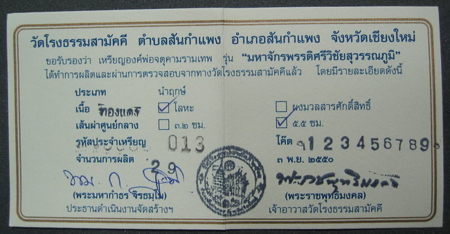 ศูนย์พระเครื่อง phantippowertools.com พระแท้ ตามมาตรฐานสากล ยินดีต้อนรับ นักนิยมสะสมพระเครื่องทุกท่าน เราบริการให้เช่าบูชา พระเครื่อง พระกรุ พระเนื้อดิน เหรียญคณาจารย์ ต่างๆ ในราคาย่อมเยาว์ มีทั้งประเภทรับประกันแท้ และ ประเภทวัดดวง ( ไม่มีการรับประกัน ) สำหรับพระเครื่องที่อยู่ในหน้านี้ รับประกันแท้ทุกองค์ ตามมาตรฐานสากล ติดต่อสอบถามที่ โทรศัพท์ 056-310760 มือถือ 081- 7075038 จตุคามรามเทพ รุ่น มหาจักรพรรดิ์ศรีวิชัยสุวรรณภูมิ เหรียญบาตรนํ้ามนต์ เนื้อทองแดง นำฤกษ์ ขนาด 5.5 ซ.ม. เข้มขลังดุดัน และ อ่อนช้อย หมาบเลขกำกับเหรียญ 13 โค๊ตพิเศษ ๑๒๓๔๕๖๗๘๙ สภาพคัดสวย รายการที่ D 391 ราคาเช่าบูชา 2,200 บาท นี่คืออีกหนึ่งผลงานของช่างเม้าท์ จำนวนการสร้าง 29 องค์