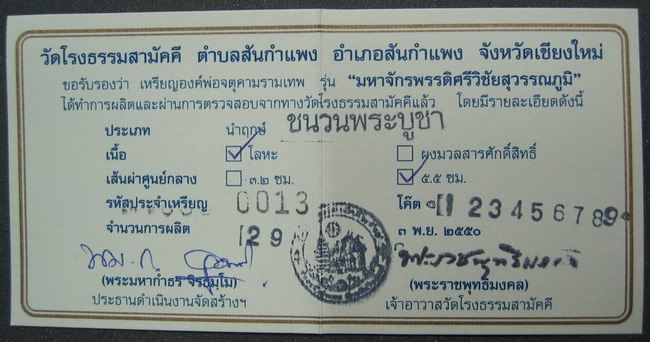 ศูนย์พระเครื่อง phantippowertools.com พระแท้ ตามมาตรฐานสากล ยินดีต้อนรับ นักนิยมสะสมพระเครื่องทุกท่าน เราบริการให้เช่าบูชา พระเครื่อง พระกรุ พระเนื้อดิน เหรียญคณาจารย์ ต่างๆ ในราคาย่อมเยาว์ มีทั้งประเภทรับประกันแท้ และ ประเภทวัดดวง ( ไม่มีการรับประกัน ) สำหรับพระเครื่องที่อยู่ในหน้านี้ รับประกันแท้ทุกองค์ ตามมาตรฐานสากล ติดต่อสอบถามที่ โทรศัพท์ 056-310760 มือถือ 081- 7075038 จตุคามรามเทพ รุ่น มหาจักรพรรดิ์ศรีวิชัยสุวรรณภูมิ เหรียญบาตรนํ้ามนต์ เนื้อชนวนพระบูชา นำฤกษ์ ขนาด 5.5 ซ.ม. เข้มขลังดุดัน และ อ่อนช้อย หมาบเลขกำกับเหรียญ 13 ตอกโค๊ตพิเศษ ๑๒๓๔๕๖๗๘๙ สภาพสภาพคัดสวย รายการที่ D 395 ราคาเช่าบูชา 2,200 บาท นี่คืออีกหนึ่งผลงานของช่างเม้าท์ จำนวนการสร้าง 29 องค์