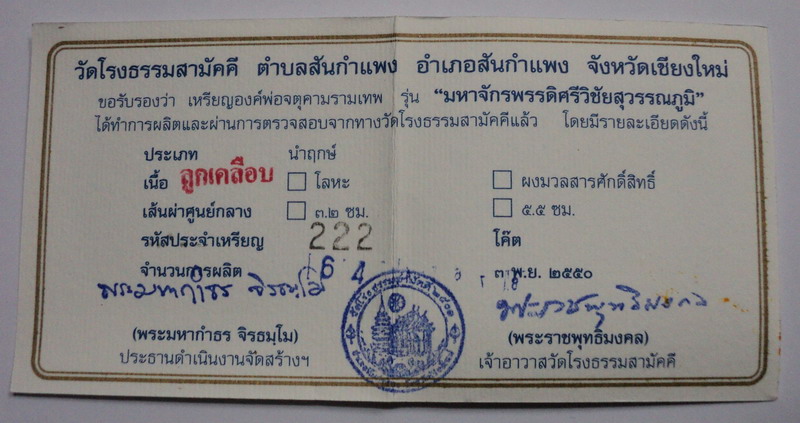 ศูนย์พระเครื่อง phantippowertools.com พระแท้ ตามมาตรฐานสากล ยินดีต้อนรับ นักนิยมสะสมพระเครื่องทุกท่าน เราบริการให้เช่าบูชา พระเครื่อง พระกรุ พระเนื้อดิน เหรียญคณาจารย์ ต่างๆ ในราคาย่อมเยาว์ มีทั้งประเภทรับประกันแท้ และ ประเภทวัดดวง ( ไม่มีการรับประกัน ) สำหรับพระเครื่องที่อยู่ในหน้านี้ รับประกันแท้ทุกองค์ ตามมาตรฐานสากล ติดต่อสอบถามที่ โทรศัพท์ 056-310760 มือถือ 081- 7075038 จตุคามรามเทพ รุ่น มหาจักรพรรดิ์ศรีวิชัยสุวรรณภูมิ เนื้อกระเบื้องเคลือบสีส้ม หมายเลข 222 จำนวนการผลิต 64 องค์ รายการทีี่ G 505 ราคาเช่าบูชา 250 บาท
