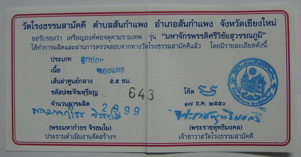 จตุคามรามเทพ รุ่น มหาจักรพรรดิ์ศรีวิชัยสุวรรณภูมิ เหรียญบาตรนํ้ามนต์ เนื้อทองแดง ขนาด 5.5 ซ.ม. เข้มขลังดุดัน และ อ่อนช้อย หมาบเลขกำกับเหรียญ 643 สภาพคัดสวย รายการที่ H 555 ราคาเช่าบูชากรุณาโทรสอบถาม นี่คืออีกหนึ่งผลงานของช่างเม้าท์ จำนวนการสร้าง 2,999 องค์