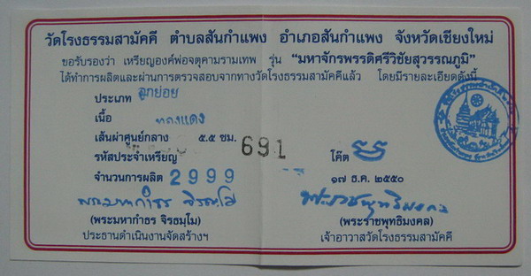 จตุคามรามเทพ รุ่น มหาจักรพรรดิ์ศรีวิชัยสุวรรณภูมิ เหรียญบาตรนํ้ามนต์ เนื้อทองแดง ขนาด 5.5 ซ.ม. เข้มขลังดุดัน และ อ่อนช้อย หมาบเลขกำกับเหรียญ 691 สภาพคัดสวย รายการที่ H 559 ราคาเช่าบูชากรุณาโทรสอบถาม นี่คืออีกหนึ่งผลงานของช่างเม้าท์ จำนวนการสร้าง 2,999 องค์