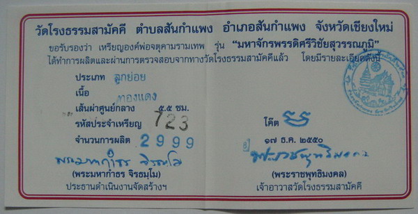 จตุคามรามเทพ รุ่น มหาจักรพรรดิ์ศรีวิชัยสุวรรณภูมิ เหรียญบาตรนํ้ามนต์ เนื้อทองแดง ขนาด 5.5 ซ.ม. เข้มขลังดุดัน และ อ่อนช้อย หมาบเลขกำกับเหรียญ 723 สภาพคัดสวย รายการที่ H 562 ราคาเช่าบูชากรุณาโทรสอบถาม นี่คืออีกหนึ่งผลงานของช่างเม้าท์ จำนวนการสร้าง 2,999 องค์