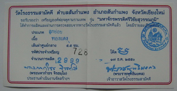 จตุคามรามเทพ รุ่น มหาจักรพรรดิ์ศรีวิชัยสุวรรณภูมิ เหรียญบาตรนํ้ามนต์ เนื้อทองแดง ขนาด 5.5 ซ.ม. เข้มขลังดุดัน และ อ่อนช้อย หมาบเลขกำกับเหรียญ 728 สภาพคัดสวย รายการที่ H 563 ราคาเช่าบูชากรุณาโทรสอบถาม นี่คืออีกหนึ่งผลงานของช่างเม้าท์ จำนวนการสร้าง 2,999 องค์