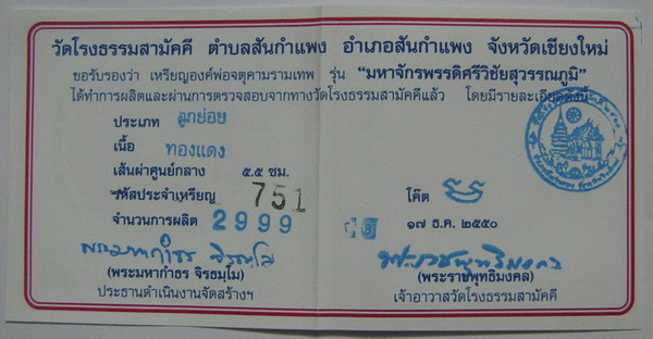 จตุคามรามเทพ รุ่น มหาจักรพรรดิ์ศรีวิชัยสุวรรณภูมิ เหรียญบาตรนํ้ามนต์ เนื้อทองแดง ขนาด 5.5 ซ.ม. เข้มขลังดุดัน และ อ่อนช้อย หมาบเลขกำกับเหรียญ 751 สภาพคัดสวย รายการที่ H 567 ราคาเช่าบูชากรุณาโทรสอบถาม นี่คืออีกหนึ่งผลงานของช่างเม้าท์ จำนวนการสร้าง 2,999 องค์