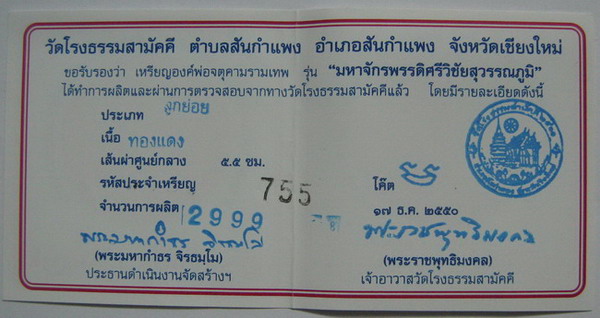 จตุคามรามเทพ รุ่น มหาจักรพรรดิ์ศรีวิชัยสุวรรณภูมิ เหรียญบาตรนํ้ามนต์ เนื้อทองแดง ขนาด 5.5 ซ.ม. เข้มขลังดุดัน และ อ่อนช้อย หมาบเลขกำกับเหรียญ 755 สภาพคัดสวย รายการที่ H 568 ราคาเช่าบูชากรุณาโทรสอบถาม นี่คืออีกหนึ่งผลงานของช่างเม้าท์ จำนวนการสร้าง 2,999 องค์