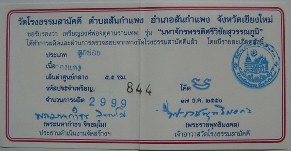 จตุคามรามเทพ รุ่น มหาจักรพรรดิ์ศรีวิชัยสุวรรณภูมิ เหรียญบาตรนํ้ามนต์ เนื้อทองแดง ขนาด 5.5 ซ.ม. เข้มขลังดุดัน และ อ่อนช้อย หมาบเลขกำกับเหรียญ 844 สภาพคัดสวย รายการที่ H 574 ราคาเช่าบูชากรุณาโทรสอบถาม นี่คืออีกหนึ่งผลงานของช่างเม้าท์ จำนวนการสร้าง 2,999 องค์