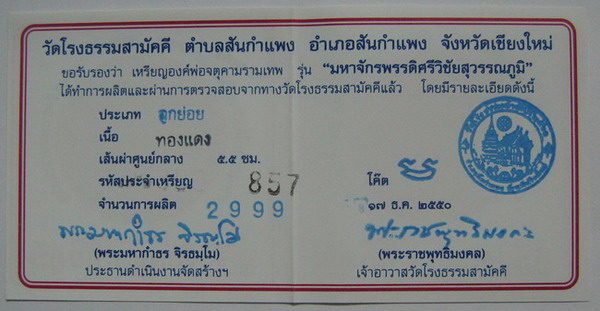 จตุคามรามเทพ รุ่น มหาจักรพรรดิ์ศรีวิชัยสุวรรณภูมิ เหรียญบาตรนํ้ามนต์ เนื้อทองแดง ขนาด 5.5 ซ.ม. เข้มขลังดุดัน และ อ่อนช้อย หมาบเลขกำกับเหรียญ 857 สภาพคัดสวย รายการที่ H 577 ราคาเช่าบูชากรุณาโทรสอบถาม นี่คืออีกหนึ่งผลงานของช่างเม้าท์ จำนวนการสร้าง 2,999 องค์
