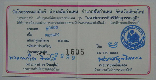 จตุคามรามเทพ รุ่น มหาจักรพรรดิ์ศรีวิชัยสุวรรณภูมิ เหรียญบาตรนํ้ามนต์ เนื้อทองแดง ขนาด 5.5 ซ.ม. เข้มขลังดุดัน และ อ่อนช้อย หมาบเลขกำกับเหรียญ 1605 สภาพคัดสวย รายการที่ H 582 ราคาเช่าบูชากรุณาโทรสอบถาม นี่คืออีกหนึ่งผลงานของช่างเม้าท์ จำนวนการสร้าง 2,999 องค์