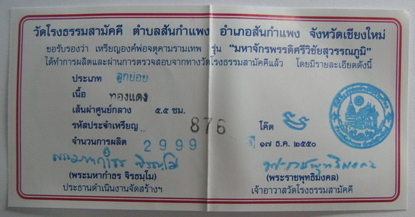 จตุคามรามเทพ รุ่น มหาจักรพรรดิ์ศรีวิชัยสุวรรณภูมิ เหรียญบาตรนํ้ามนต์ เนื้อทองแดง ขนาด 5.5 ซ.ม. เข้มขลังดุดัน และ อ่อนช้อย หมาบเลขกำกับเหรียญ 876 สภาพคัดสวย รายการที่ H 588 ราคาเช่าบูชากรุณาโทรสอบถาม นี่คืออีกหนึ่งผลงานของช่างเม้าท์ จำนวนการสร้าง 2,999 องค์