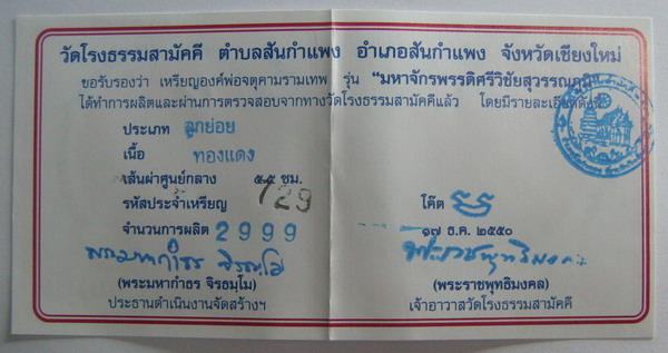 จตุคามรามเทพ รุ่น มหาจักรพรรดิ์ศรีวิชัยสุวรรณภูมิ เหรียญบาตรนํ้ามนต์ เนื้อทองแดง ขนาด 5.5 ซ.ม. เข้มขลังดุดัน และ อ่อนช้อย หมาบเลขกำกับเหรียญ 729 สภาพคัดสวย รายการที่ H 594 ราคาเช่าบูชากรุณาโทรสอบถาม นี่คืออีกหนึ่งผลงานของช่างเม้าท์ จำนวนการสร้าง 2,999 องค์