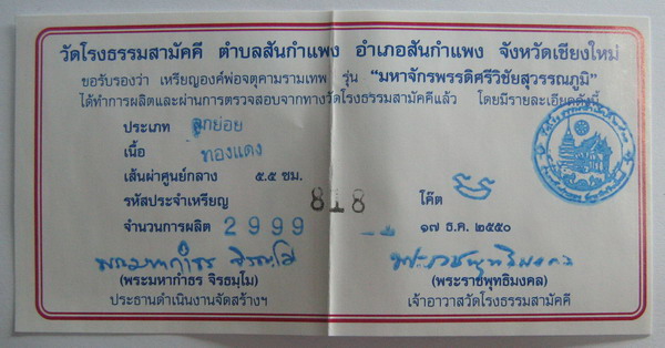 จตุคามรามเทพ รุ่น มหาจักรพรรดิ์ศรีวิชัยสุวรรณภูมิ เหรียญบาตรนํ้ามนต์ เนื้อทองแดง ขนาด 5.5 ซ.ม. เข้มขลังดุดัน และ อ่อนช้อย หมาบเลขกำกับเหรียญ 818 สภาพคัดสวย รายการที่ H 600 ราคาเช่าบูชากรุณาโทรสอบถาม นี่คืออีกหนึ่งผลงานของช่างเม้าท์ จำนวนการสร้าง 2,999 องค์ ค่าจัดส่งทางไปรษณีย์ EMS ทั่วประเทศ ฟรี ............ ยกเว้น พระเครื่องที่มีนํ้าหนักมาก และ จตุคามรามเทพ กรณี สั่งซื้อเช่าบูชาจำนวนมาก ขอจัดส่งแบบ ลงทะเบียน หรือ LOGISTIC โอนเงินมาที่ ธนาคารกสิกรไทย สาขาถนนสายเอเซีย หมายเลขบัญชีออมทรัพย์เลขที่ 403-2-25342-9 หรือ