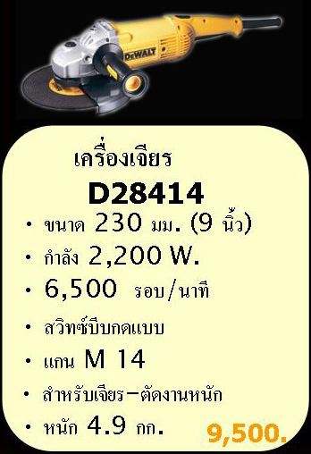 เครื่องเจียร์ขนาด 9 นิ้ว DEWALT รุ่น D28414 ราคาเครื่องละ 5,625บาท ราคา NET ยังไม่รวม VAT