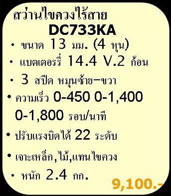 สว่านไฟฟ้า ไร้สาย DEWALT รุ่น DC733KA-B1 ราคาเครื่องละ 5,605 บาท ราคา NET ยังไม่รวม VAT