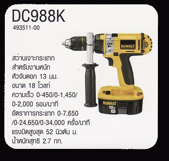 สว่านเจาะกระแทกไร้สาย DEWALT รุ่น DC988K ราคาเครื่องละ 11,725 บาท ราคา NET ยังไม่รวม VAT