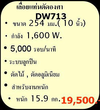เลื่อยแท่นตัด องศา DEWALT รุ่น DW 713 ราคาเครื่องละ 11,725 บาท ราคา NET ยังไม่รวม VAT