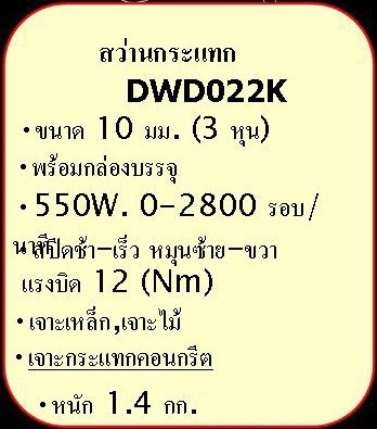 สว่านกระแทก ขนาด 10 M DEWALT รุ่น DWD 022K ราคาเครื่องละ 1,950 บาท ราคา NET ยังไม่รวม VAT