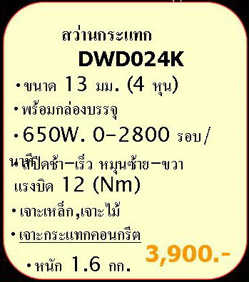 สว่านกระแทก ขนาด 13 M DEWALT รุ่น DWD 024 K ราคาเครื่องละ 3,900 บาท