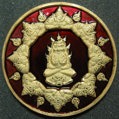 จตุคามรามเทพ รุ่น จอมจักรพรรดิ์มหาบารมี ปีพ.ศ. 2550 เหรียญกะไหล่ทอง ลงยาสีแดง พิมพ์พระปิดตาพังพกาฬ ขนาด 3.2ซ.ม.