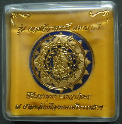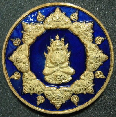 จตุคามรามเทพ รุ่น จอมจักรพรรดิ์มหาบารมี ปีพ.ศ. 2550 เหรียญกะไหล่ทอง ลงยาสีน้ำเงิน พิมพ์ปิดตาพังพกาฬขนาด 3.2ซ.ม.
