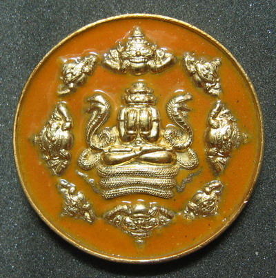 เหรียญ กะไหล่ทองลงยาสีส้ม ขนาด 3.2ซ.ม. จตุคามรามเทพ รุ่น ทรัพย์เทวา พิมพ์พังพกาฬ
